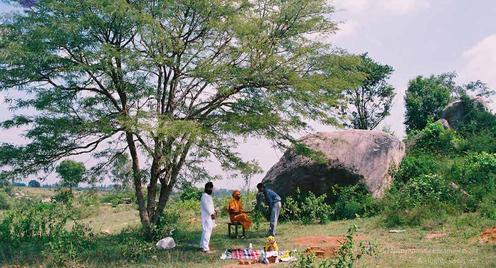 In late 2002, the search for the envisioned Banyan tree came to fruition, again with another intervention of Paramaśiva Himself. Śri Pratap Rao lived in rural Karnataka and was at the time running a snake farm business in the land which he inherited through his ancestry. The land was the home of a very ancient tree. The origins of said tree were not quite known to him and it remained a mystery to his family. They only knew it was guarded by a powerful divinity and radiated a unique energy. Śri Prathap was very attached to the tree as he was seeing it as his personal deity since he was a child so when people requested a price for the land, he would deny them upfront. One day, Śri Pratap Rao had a dream of Dakshinamurthy (a form of Paramaśiva) who told him to donate his land inheritance to a smiling young Swami with a turban by the name of Śri Nithyānanda Swami. He began His search for the smiling young Swami. Eventually, he sought the guidance of Śri Tiruchy Swami who directed him to Śri Shantaveera Mahaswami. Realizing that this would be the sacred place where The SPH would revive the Adi Peetha Kolada Mutt and the Hindu civilization in Karnataka, Śri Shantaveera Mahaswami guided him to meet The SPH in Omkar Hills, where The SPH was staying at the time. Upon seeing The SPH, Śri Pratap was overwhelmed with joy to finally have realized his dream and immediately donated the land with the great banyan tree to the smiling young Swami. Banyan trees live for hundreds of years, die and come back in the same spot again and again. This divine tree was the very tree that sheltered Paramaśiva and Paramaśiva Śakti as He revealed the Āgamas to His divine consort. On this sacred land, the Kingdom of Adi KAILĀSA Sarvajnapeetha was born, an extension of the ancient Kingdom of Adi Peetham.
